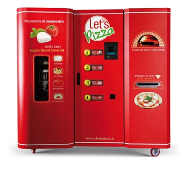A partir de este momento, tus clientes podrán disfrutar del aroma y sabor de una pizza fresca hecha con los mejores productos en cualquier momento,las 24 horas del dia los 365 días del año. Esto es Let’s Pizza, la única máquina del mundo capaz de preparar una pizza a partir del agua y la harina con ingredientes frescos, cocida ante tus propios ojos y en menos de tres minutos. Aunque tú no lo creas! Let’s Pizza da un paso adelante y deja atrás esas pizzas congeladas. Su deliciosa masa se obtiene gracias a un moderno sistema de infrarrojos que logran una perfecta cocción. Let’s Pizza es capaz de amasar la harina con el agua, estirarla y añadir los ingredientes frescos, según la variedad de pizza escogida a través de un intuitivo sistema de elección.