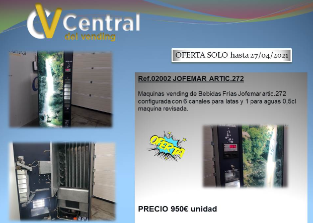 Se venden maquinas Vending Jofemar Artic 272 configurada con 6 canales para latas y 1 para aguas 0,5 cl. Maquina revisada