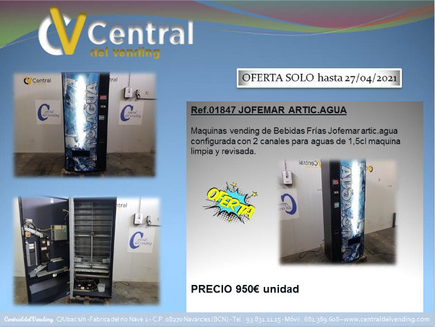 Se venden maquinas de vending Jofemar artic agua. Configurada con 2 canales para agua de 1,5 l. maquina limpia y revisada