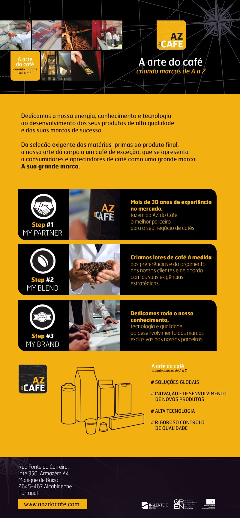Somos a sua torrefação. Dedicamos a nossa energia, conhecimento e tecnologia ao desenvolvimento dos seus produtos de alta qualidade e das suas marcas de sucesso. Da seleção exigente das matérias-primas ao produto final, a nossa arte dá corpo a um café de exceção, que se apresenta a consumidores e apreciadores de café como uma grande marca. A sua. Contacte-nos, temos com certeza uma solução à sua medida. T. +351 214580165 E-mail: geral@aaz.pt www.aazdocafe.pt SOMOS SU TORREFACCIÓN DEDICAMOS NUESTRA ENERGÍA, CONOCIMIENTO Y TECNOLOGÍA AL DESARROLLO DE PRODUCTOS DE ALTA CALIDAD Y DE MARCAS COM ÉXITO. DESDE LA SELECCIÓN DE LA MÁS EXIGENTE DE MATERIA PRIMA AL PRODUCTO FINAL, NUESTRO ARTE DÁ CUERPO A UN CAFÉ ESQUISITO, QUE SE PRESENTA A LOS CONSUMIDORES Y APRECIADORES DE CAFÉ COMO UNA GRAN MARCA. LA SUYA. T. +351 214580165 E-mail: geral@aaz.pt www.aazdocafe.pt