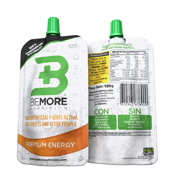 POTENCIA NATURAL BEMORE ES UN PRODUCTO HECHO ÚNICA Y EXCLUSÍVAMENTE DE INGREDIENTES NATURALES DE ALTA CALIDAD. Un alimento sin azúcares añadidos, ni colorantes, ni gluten y ni siquiera conservantes. Un producto con un poder natural diseñado para ser consumido 30 minutos antes del ejercicio. Perfecto para entrenamientos y competiciones, fácil de llevar y resistente a temperaturas adversas. Gracias a su elaboración y composición, se consigue una rápida digestión y una lenta absorción de energía, suficiente para una actividad de hasta 2-3 horas de alta intensidad. Y todo ello sin ser un producto hipercalórico, aportando los macronutrientes necesarios junto con una dieta equilibrada para realizar una actividad física. Contiene azúcares simples, para un aporte rápido de energía, e hidratos de carbono complejo, para un aporte energético más prolongado en el tiempo y constante durante el desarrollo del ejercicio. El sueño de todo deportista, un valor añadido que hace de Bemore el suplemento alimenticio ideal para los deportistas.