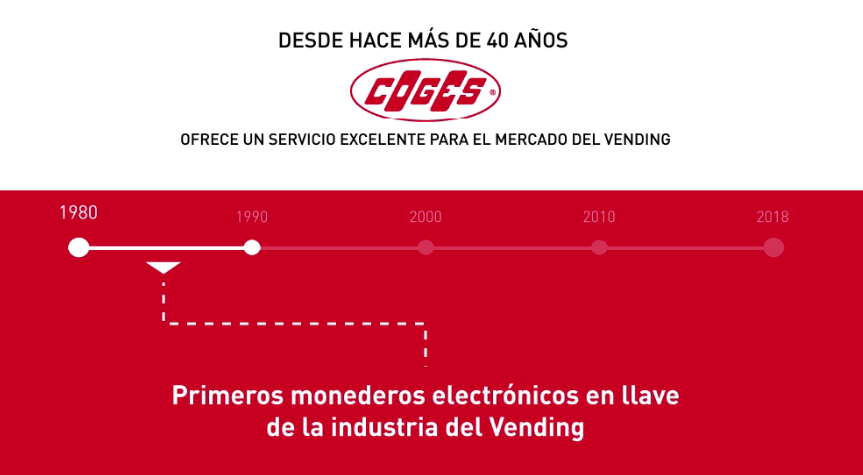 Constituida en 1977, Coges nace como una empresa dedicada exclusivamente a la construcción de monederos. Con el pasar de los años, las diferentes condiciones del mercado llevan a la empresa a ampliar su gama de productos, llegando a ofrecer en la actualidad una amplia gama de soluciones, tanto en el sector de los sistemas de pago, como en el de la distribución automática. Coges, gracias a una experiencia de treinta años en el sector del vending, se coloca en la actualidad como empresa líder a nivel europeo en el diseño y en la producción de sistemas de pago cashless y al contado. Una constante evolución organizativa y una marcada vocación a la investigación tecnológica aplicada son nuestros principales factores de éxito. De hecho, estas características nos permiten proponer soluciones innovadoras e integradas que satisfacen las más específicas exigencias del cliente, ofreciendo una gama de productos completa. INFORMACIONES TÉCNICAS: http://www.coges.es/jsp/es/download/index.jsp
