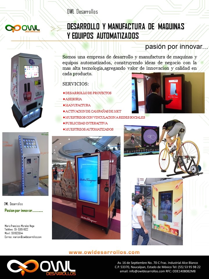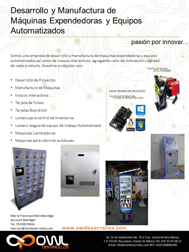 Owl Desarrollos es una empresa dedicada al desarrollo y manufactura de maquinas automatizadas para el mercado vending,BTL y la industria, nuestros servicios son: