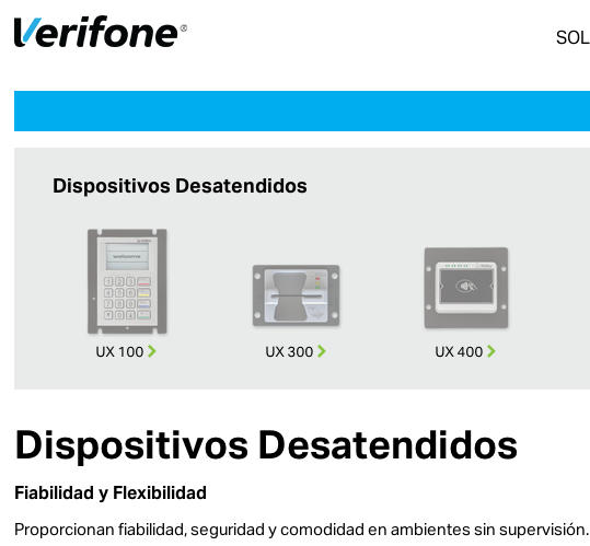 Soluciones de pago para todo tipo de entornos desatendidos Tanto si va a instalar una máquina vending de comida y bebida, de tickets para un parking, peaje o para los surtidores de las gasolineras, necesita soluciones de pago desatendidas que sean altamente seguras, resistentes y fáciles de instalar y utilizar. Seguridad: Verifone integra los dispositivos hardware con el software de pago, utiliza la tecnología más avanzada para la protección de datos y cumplen los últimos estándares de seguridad. Fácil Integración: Los sistemas de Verifone se integran perfectamente con las máquinas de auto-servicio existentes para crear soluciones personalizadas y flexibles. Durabilidad: Diseños que resisten tanto la manipulación como los entornos exteriores más exigentes cumpliendo las normativas IP65 e IK09 y temperaturas operativas de -25ºC a 60ºC. Facilidad de uso: las pantallas y los lectores de las tarjetas permiten transacciones sencillas y eficientes tanto si es con chip y pin (EMV), banda magnética o NFC /Contactless.