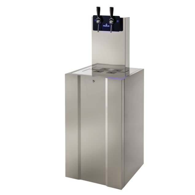 El refrigerador de agua de suelo funcional, rentable, sencillo… capaz de llenar dos botellas al mismo tiempo! Con grifos mecánicos manuales. 2 opciones de suministro: agua fría con y sin gas. Realizada completamente en acero inoxidable, con panel frontal en plexiglás retroiluminado. Espacio interno para alojar el cartucho de filtrado y UV en línea. Gasificador profesional en acero inoxidable. Serpentín de enfriamiento doble, uno para el agua fría y el otro para el agua con gas. Banco de hielo de alto aislamiento para una elevada producción de agua fría, con y sin gas.