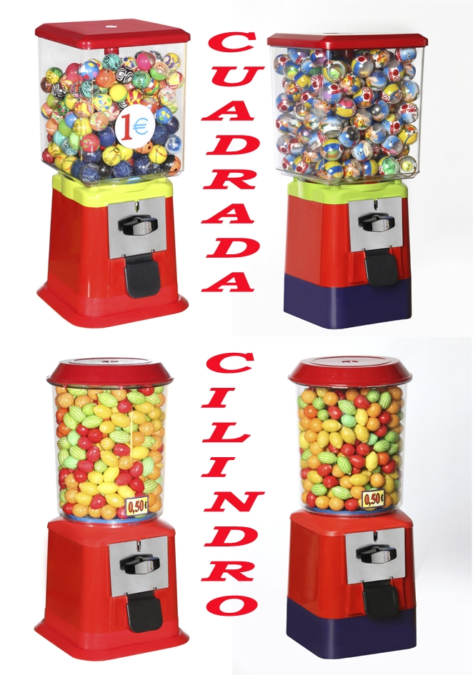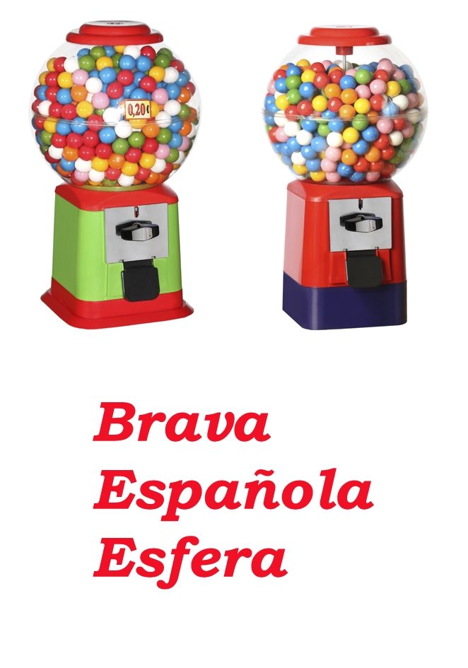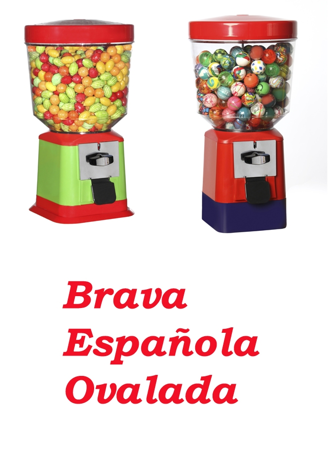 Expendedora Brava Española. La expendedora más demandada. Apta para chicles, caramelos, bolas saltarinas, frutos secos a granel. Hay varios tipos: con globo cilindro, cuadrado, ovalado o esfera y todos ellos a elegir con cajón monedas, que facilita muchísimo la recaudación, reduce los tiempos o sin cajón. Aptas para bolas de 24 a 35 mm o granel. tenemos 3 tipos de distribuidores para bolas: diámetro interno 32, 38 o 43 mm y otro distribuidor para granel. Como tenemos distintos tipos de distribuidores, se debe especificar que tipo de producto quiere que la máquina expenda para montar el distribuidor adecuado. Hay cuatro tipo de globos: ovalado, cilindro, cuadrado o esfera. Capacidad: va a depender del globo seleccionado, del tipo de producto y del diámetro del mismo. Veáse capacidad aproximada: - Esfera: 650 unidades de bolas de 24/25 mm; 550 unidades de bolas de 28/30 mm, 300 uni. de bolas de 32/33 mm, 200 uni de bolas de 35 mm, 5.5 kgs de almendra frita, 5 kgs de pistacho. - Cilindro: 300 unidades de bolas de 24/25 mm, 250 uni. de bolas de 28-30 mm, 140 uni de bolas de 32/33 mm, 110 uni. de bolas de 35 mm, 2.5 kgs de almendra frita, 2 kgs de pistacho. - Cuadrada: 550 uni. de bolas de 24-25 mm, 450 uni. de bolas de 28-30 mm, 250 bolas de 32/33 mm, 175 bolas de 35 mm, 4.5 kgs de almendra frita, 4 kgs de pistacho. - Ovalada: 600 bolas de 24/25 mm, 500 bolas de 28-30 mm, 280 bolas de 32/33mm, 190 bolas de 35 mm, 5 kgs de almendra frita, 4.5 kgs de pistachos. Fabricada en plástico ABS y PC. Dimensiones y peso aproximado: Esfera sin cajón: 26 x 27 x 43,5 cms; 2,35 kgs Esfera con cajón: 26 x 27 x 46,5 cms; 2,45 kgs Ovalada sin cajón: 25 x 25 x 45,5 cms; 2.20 kgs Ovalada con cajón: 25 x 25 x 48.5 cms; 2.30 kgs Cuadrada sin cajón: 20 x 20 x 43,5 cms; 2.30 kgs Cuadrada con cajón: 20 x 20 x 46,5 cms; 2.40 kgs Cilindro sin cajón: 20 x 20 x 43 cms; 2 kgs Cilindro con cajón: 20 x 20 x 46 cms; 2,10 kgs