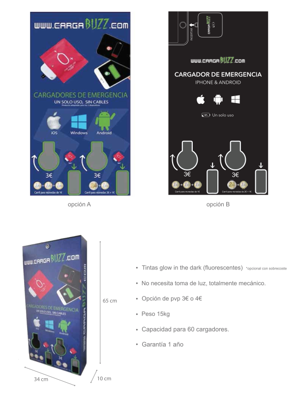 Cargabuzz.com Minivending expendedora de cargadores de un solo uso para todo tipo de dispositivos móviles. 65cm x 34cm x 10cm. Capacidad de 30 cargadores.
