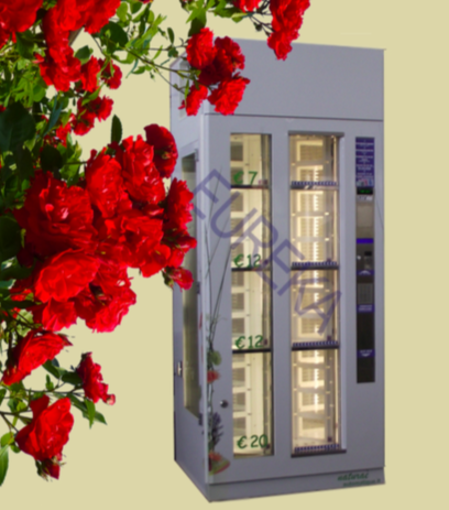 Máquina para la venta de grandes ramos y arreglos florales. Puede vender de 18-24 ramos grandes y medianos (36-48 configuración doble). 3 o 4 ventanillas de aperturas automáticas. 12 soportes con cono para la conserva de agua.