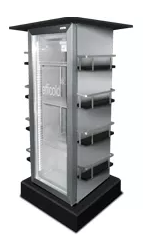 Refrigerante hidrocarburo R-600a Control de temperatura mediante termostato digital Compresor hermético de alto par de arranque Aislamiento de poliuretano inyectado de 40kg/m3 de densidad Triple acristalamiento sobre bastidor de aluminio anodizado acabado inox satinado Exterior en acero inoxidable austenítico AISI-430 satinado e interior en AISI-201 mate Estructura con tubo de acero pintado en epoxi gris apariencia inox Estantes y encimera en madera con PVC negro en la cara superior y cantos y melamina en la cara inferior Doble iluminación interior mediante leds, situada verticalmente en ambos costados