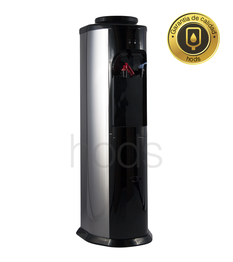 Dispensador de Agua Elegance Negra con laterales metálicos con revestimiento inoxidable. Un diseño que lleva la elegancia a un nivel superior, ideal para oficinas o recepciones de empresas que dan mucha importancia a la imagen que dan a su público. También en este modelo, buscamos la más alta calidad a un precio razonable. Por este motivo, este dispensador ha sido mejorado todavía más para aumentar sus prestaciones y la satisfacción del cliente. Asimismo, incluye un compresor más eficiente y unos termostatos mejorados que aumentan la capacidad de enfriamiento, reducen el consumo de energía y lo vuelven mucho más silencioso. La calidad también ser percibe en los laterales que han sido sometidos a un tratamiento anticorrosivo. Además, incorpora un Sistema Antiderrame que funciona con una boya interna que evita el desbordamiento de agua cuando la capacidad del tanque de agua del dispensador suba del nivel adecuado. Por ello, evita cualquier derrame excesivo de agua del botellón a la máquina. Además, todos los tubos en contacto con el agua son de ACERO INOXIDABLE lo que aporta salubridad por su higiene y por la no migración de sabor a plástico en el agua como en el resto de máquinas del mercado. El dispensador de agua Elegance Negra también está disponible en color Blanco y en filtración. Enfría y calienta el agua. Además, incorpora un recogegotas por si se derrama agua del vaso que se está llenado. Incluye un regulador de temperatura para el agua permitiendo ajustar la temperatura a demanda y un grifo de seguridad para el agua caliente que previene de quemaduras accidentales. También permite desactivar el agua caliente lo que ofrece la posibilidad de tener un grifo de agua natural (agua a temperatura ambiente). Como resultado final, es también un dispensador de agua fría y agua natural. Este dispensador es compatible con todos nuestros botellones PET en sus diferentes formatos y se le puede añadir accesorios como nuestro nuevo Portavasos transparente, además de ser perfecto para ser acompañado por nuestra Estantería metálica de color negro para 4 botellones PET.
