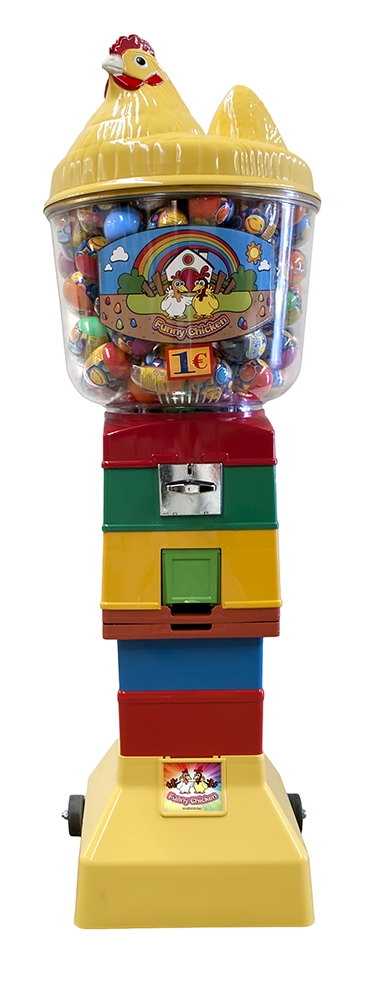 Adiós a la antigua base de metal, más pesada, menos resistente sobre todo en el exterior. Por fín disponible con base de abs. Ahora, mucho más llamativa y más resistente. Le gustará. También se puede adquirir, no obstante, sin base, para colocarla de sobre mesa o sobre algún otro soporte de su agrado. Expendedora muy atractiva para los niños. Una gallinita adorable que atraerá sus miradas. Apta para cápsulas de 90 mm o huevos de 68 mm. Capacidad: 75 bolas de 90 o 150 huevos de 68 mm Dimensiones y peso (sin base): 90 x 46 x 46 cms; 7.5 kgs. Con base, 143x46x46, 12.4 kgs