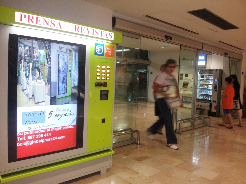 Innovadora máquina vending 24 horas de prensa, revistas y publicaciones en general como pueden ser libros, merchandising... Integra una pantalla digital de 55" Full HD, conexión a internet con wifi y bluetooth. Amplias posibilidades de ser instaladas en Centros Comerciales, estaciones, avenidas de ciudad... En la pantalla se ofrece principalmente publicidad de comercios de la zona, si bien se puede añadir espacios de entretenimiento, información turística...