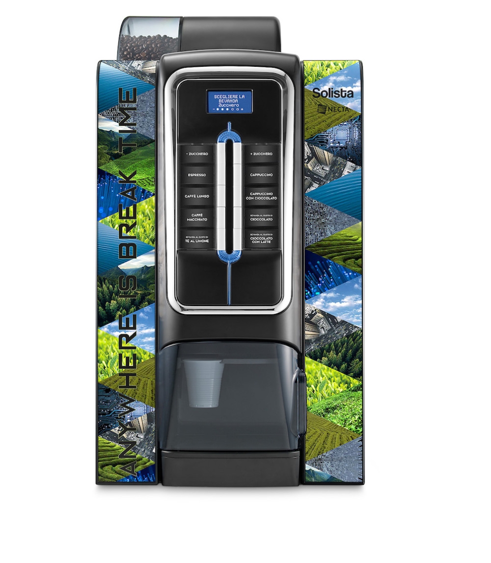 Un punto de referencia para los modelos de mesa. Solista continúa la dedicación de Necta a brindar bebidas de alta calidad a lugares más pequeños. Entre los productos de sobremesa, muestra su diseño elegante y puede ser apreciado por su alto nivel de capacidad y rendimiento tecnológico . Las luces LED completan el diseño elegante y contemporáneo, así como el marco cromado que rodea el área de selección y los elegantes paneles gráficos laterales. Todas estas características demuestran la artesanía y el diseño innovador de Solita , que lo convierten en un punto de referencia para el resto del mercado.