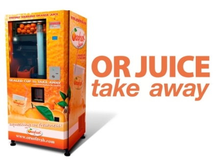 OR Juice Take Away es la primera máquina que distribuye zumo de naranja fresca recién exprimido en un práctico envase para llevar, térmicamente sellado para que el contenido pueda ser consumido o conservado en el frigorífico hasta 48 horas desde su envasado. Con Oranfresh puedes llevarte a casa o a la oficina la frescura de la naranja recién exprimida.