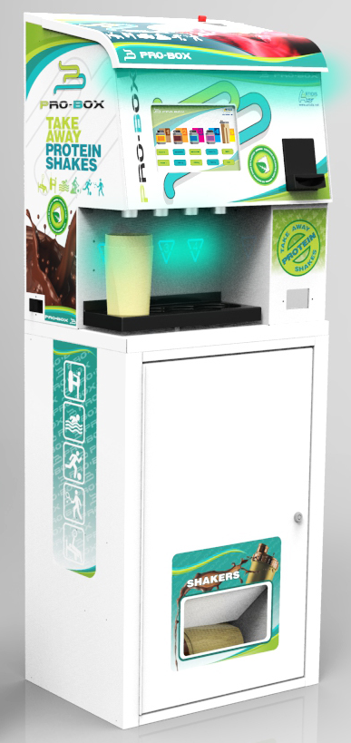 Reinventamos las máquinas de suplementos. PRO-BOX Concept. Una nueva forma de hacer batidos. Pro-Box es una máquina dispensadora de cualquier suplemento en polvo. Nuestra mayor novedad es que no utiliza agua. Gracias a ello Pro-Box es una máquina sencilla de instalar, solo necesitas conectarla a la red eléctrica. Sin tuberías ni desagües. Respetuosa con el medio ambiente y el planeta, ni una gota más de agua desperdiciada. Se acabaron las limpiezas internas y los costosos mantenimientos. Compacta, robusta y de tamaño reducido, ideal para su colocación de sobremesa en el lugar que más lo necesites o bien colocarla sobre su peana diseñada como dispensadora de shakers o la peana almacén. Pensada para su utilización tanto en gimnasios de cualquier tamaño como en centros fitness nos proporcionará una alta rentabilidad y un gran complemento al entrenamiento diario. Puede contener hasta 4 suplementos diferentes (recuperadores, proteína, creatina, glutamina, control-diet.. etc.) compatible con todas las marcas y productos del mercado, tu eliges lo que quieres. Fácil selección de producto y cantidad a través de pantalla táctil de 10". Son muchas las novedades y ventajas que ofrece la Pro-Box, incluso su precio que es el más bajo del mercado te sorprenderá.