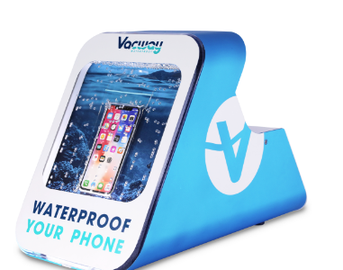 VACWAYmini, espacio, movilidad y usabilidad. Esta máquina ha sido diseñada para ofrecer el servicio de impermeabilización de Smartphones en negocios locales, como pueden ser alquileres de kayak, charters, piscinas, marinas, etc. Su gran pecera frontal muestra el producto a los clientes y genera el reclamo para la venta. La parte posterior de la máquina sirve para realizar el ciclo de impermabilización. Puede utilizar dos tipos de fundas, unas para Smartphones y otras para tablets. Además de su reducido peso y tamaño, como el de una impresora de sobremesa, puede funcionar con baterías y así tiene ese extra de movilidad tan anhelado.