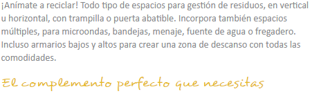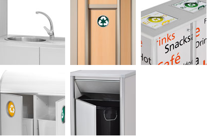 ¡Anímate a reciclar! Todo tipo de espacios para gestión de residuos, en vertical u horizontal, con trampilla o puerta abatible. Incorpora también espacios múltiples, para microondas, bandejas, menaje, fuente de agua o fregadero. Incluso armarios bajos y altos para crear una zona de descanso con todas las comodidades. EL COMPLEMENTO PERFECTO QUE NECESITAS.