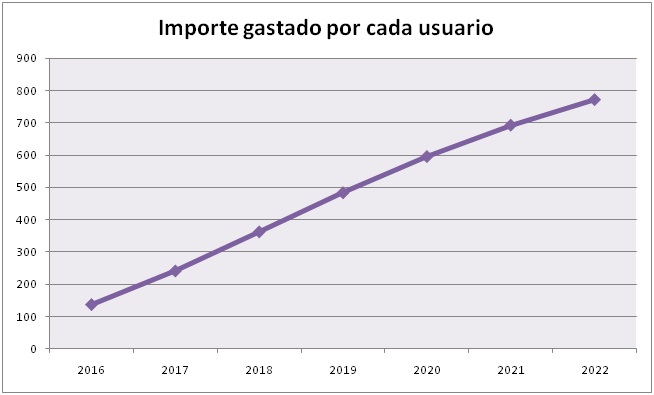 Por su parte, el dinero gastado de media por cada usuario aún se espera que se duplique de aquí al 2022, pasando de los 368 euros actuales a 772 euros. Esto quiere decir que no solo habrá más usuarios comprando a través de APPs de pago móvil, sino que además cada usuario tenderá a comprar e invertir más dinero a través de este servicio.