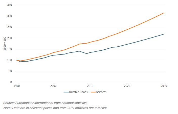 Otro cambio en el comportamiento constatado por Euromonitor es el énfasis de las experiencias sobre las posesiones. Esto ha podido comprobarse en cómo, a pesar de la crisis, siguió creciendo el gasto en servicios de distinto tipo en tanto que caía el consumo de bienes materiales.