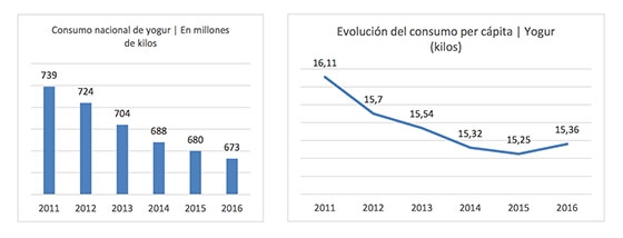 Y es que según los datos de la Organización Interprofesional Láctea, de los 739 millones de kilos de yogur que se consumieron en nuestro país en 2011 hemos pasado a 673 en 2016, un 9% menos.