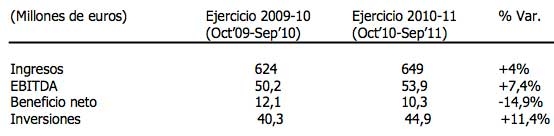 Áreas presenta sus resultados financieros del ejercicio 2011 con una facturación que alcanza los 649 millones de euros, una cifra superior en un 4% a la del pasado ejercicio. En el mismo período el EBITDA creció un 7,4%, hasta cerca de 54 millones de euros. La inversión registrada ha supuesto un mayor incremento respecto el pasado ejercicio (+11,4%), alcanzando casi los 45 millones de euros.