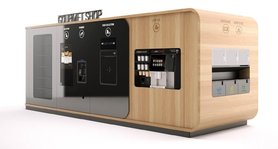 Esta solución innovadora puede ofertar hasta 180 productos para configurar un menú, a través de la selección digital de comida y bebida, al gusto del consumidor. Este concepto, que incluye un coffee-shop, sirve de forma inmediata el pedido en una bandeja.