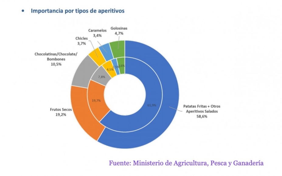 La proporción del volumen de aperitivos consumidos fuera del hogar durante 2018 quedó distribuida de la siguiente manera: patatas fritas y otros aperitivos salados es el producto más relevante dentro de la categoría, con una cuota de 58,6% de los kilos. Le sigue la categoría de frutos secos con el 19,2% del volumen y las chocolatinas, chocolate y bombones ocupan la tercera posición con el 10,5 % de los aperitivos consumidos. Finalmente, categorías con una menor relevancia como golosinas, chicles y caramelos se reparten el resto del mercado con el 4,7%, 3,7% y 3,4% respectivamente.