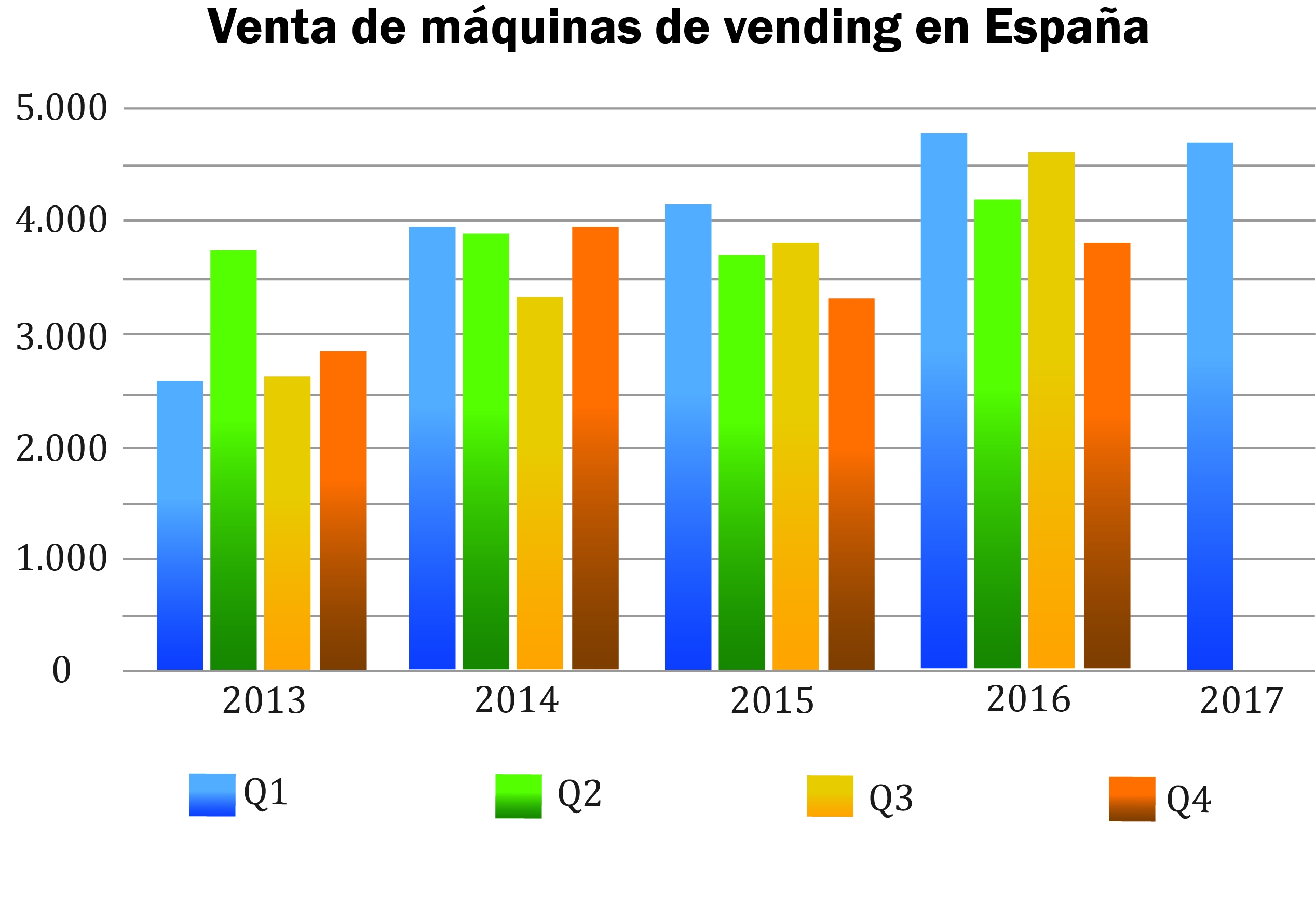 HOSTELVENDING.com 31/05/2017.- El número de máquinas vendidas en España durante el primer trimestre del año es de 4.600 unidades, lo que supone un descenso del 1% con respecto al mismo periodo del año anterior. Con esta cifra, se rompería la tendencia de los últimos cuatro años que apuntaba hacia un crecimiento ininterrumpido durante el primer trimestre del año.