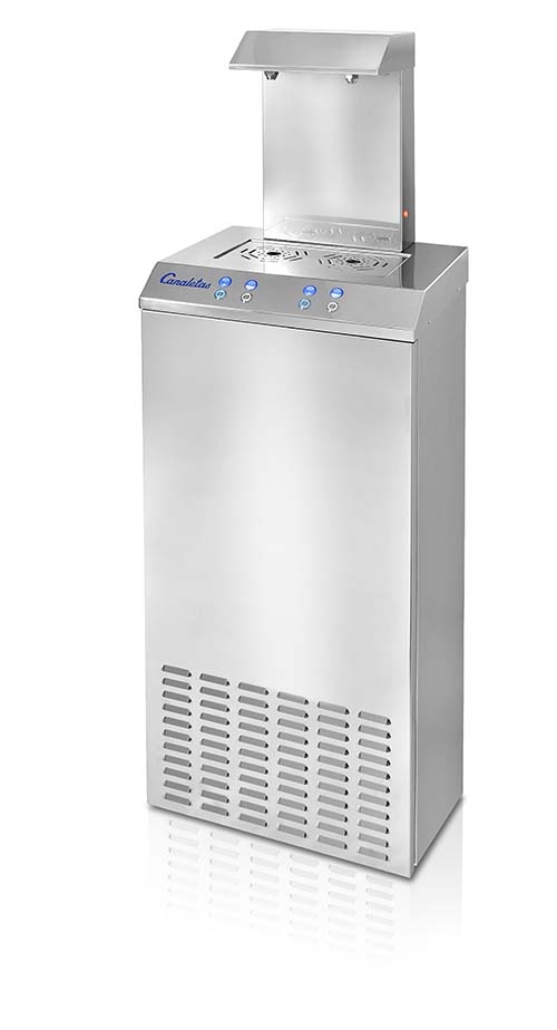 La serie GC de Canaletas, mediante banco de hielo, está fabricada en acero inoxidable como todas las fuentes de agua de esta marca y además la capacidad de suministro de agua fría se encuentra entre las más altas del sector, gracias a la elevada potencia del compresor y tamaño de la cubeta de hielo. Presenta un elegante diseño, con pulsadores de acero inoxidable luminosos, surtidores extraíbles para un fácil mantenimiento y la ventilación frontal facilita su instalación. Permite diferentes sistemas de filtrado dependiendo de la necesidad de cada cliente.
