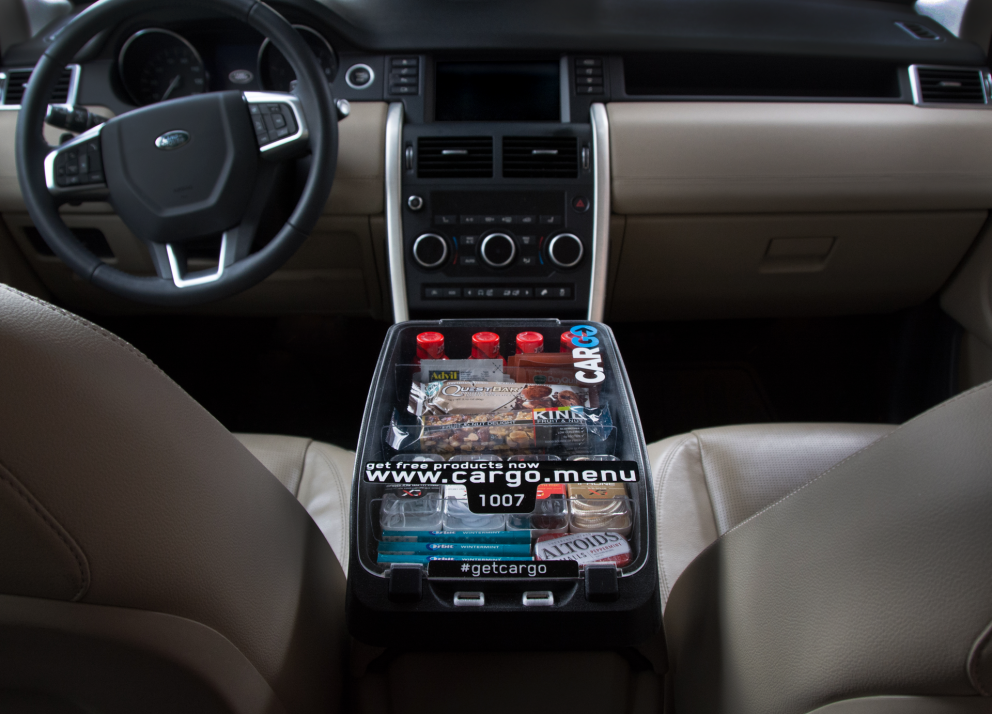 Después de que los conductores se registren de forma gratuita, Cargo les envía una pantalla personalizada que descansa en la consola central del coche y contiene una selección de aperitivos y productos esenciales. En la parte superior de la vitrina hay una URL y un número de identificación que es diferente para cada coche.