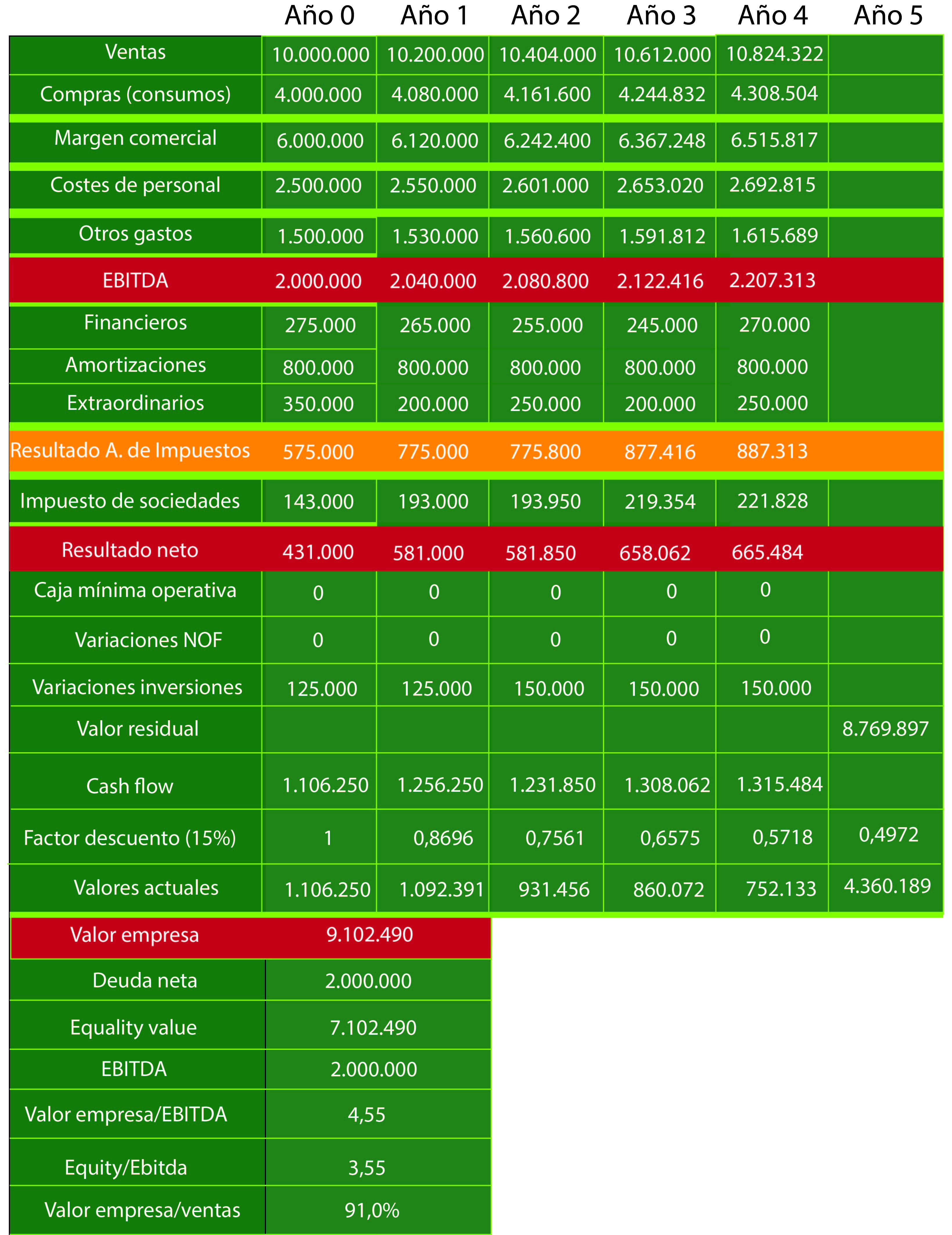En nuestro ejemplo resumido, vemos que la empresa, actualizando sus flujos de caja futuros (los cuales se supone que hemos realizado con rigor), tiene un valor de más de 9 millones de €, lo que representa 4,55 veces su EBITDA. El precio (siempre que evidentemente hubiera acuerdo), sería de algo más de 7 millones de € (una vez descontada la deuda financiera neta, calculada tal y como la hemos definido con anterioridad), y el valor empresa sobre ventas sería del 91 % de las mismas (en el sector del vending, hay que tener en cuenta el efecto de contabilización de los cánones de clientes para calcular este último ratio).