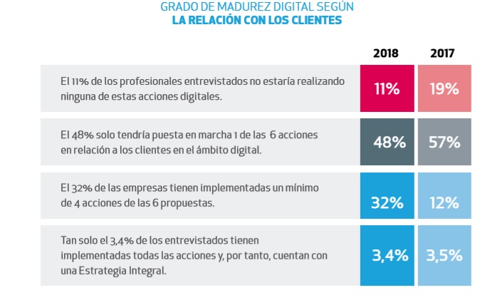 Nuevamente, y al igual que sucedió el año pasado, las empresas de España vuelven a suspender con una madurez digital de 4.1 sobre 10, lo que supone un incremento de medio punto con respecto a 2017 (3.7).