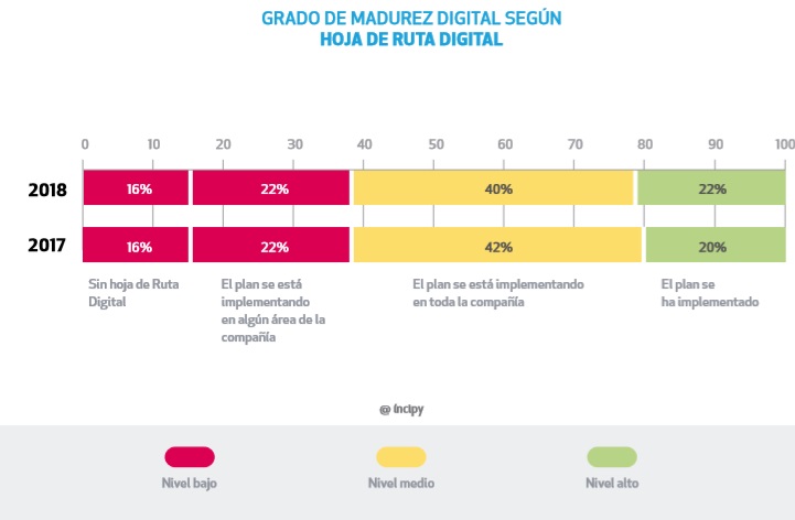 La disposición de una hoja de ruta que indique el camino a seguir es absolutamente indispensable para comenzar a alcanzar los objetivos de transformación. Este indicador apenas ha evolucionado durante este año, manteniéndose en un 38% las empresas que no tienen plan de transformación o solo lo abordan en algunas áreas.