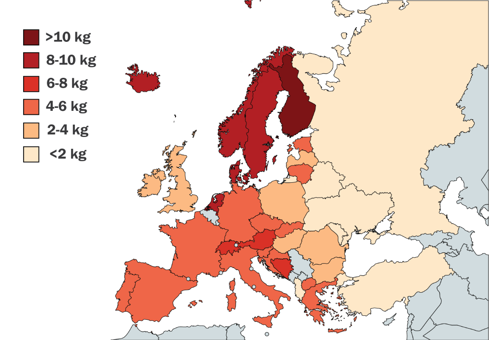 En el otro extremo se encuentra el este de Europa con países como Rusia, Ucrania, Polonia o Bielorrusia, donde el consumo que rara vez supera los 2,5 kg per cápita.