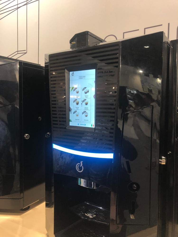 El primer alto lo hacemos en la zona de las semiautomáticas, con la Talia -de pantalla táctil de 7”- dando la bienvenida al tour. Una máquina que destaca por presentar un menú intuitivo y personalizable para ofrecer un espacio eficaz para la comunicación (y como siempre, donde haya una pantalla, habrá oportunidad de insertar publicidad y contar con otra fuente de ingresos).
