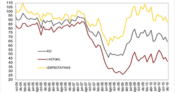 En el último mes de diciembre de 2010, el ICC se sitúa en 64,6 puntos, haciendo una media entre la situación actual (41,6 puntos) y el nivel de expectativas para los próximos seis meses (87,5). Conclusión: los españoles no vemos claro esto de la “recuperación económica” pero, pese a ello, seguimos teniendo fe en mejorar. Un último dato de gran relevancia; el ICC también registra un aumento en las perspectivas de inflación para los próximos 12 meses por parte de los consumidores. La gente sabe y está preparada para aceptar que los precios van a subir.