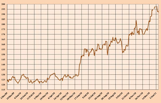 Está claro que el operador de OCS no puede soportar el mareante encarecimiento de los precios al que hemos asistido en la segunda mitad del 2010. Y no sólo en el grano de café (ver el artículo "El precio del café terminó el año con el promedio anual más alto desde 1986"), sino también en el chocolate, la leche y el azúcar. Este último, sin ir más lejos, se ha incrementado en un 140% desde el pasado mes de junio, según el índice del NYBoT-ICE (Junta de Comercio de Nueva York), hasta alcanzar una cifra récord de 33,65 centavos de dólar por libra que no se registraba desde enero de 1981. Desde la perspectiva de las azucareras españolas, el precio se ha elevado en un 58% entre septiembre de 2010 y enero de 2011.