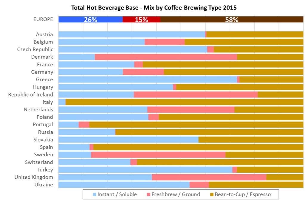 Ese equilibrio se rompe en países como Austria, República Checa, Grecia, Hungría, Turquía, Eslovaquia o Ucrania, donde el café más vendido es el soluble o instantáneo. El precio puede ser un factor importante para dar explicación a esta diferencia, así como la propia cultura y tradición o la existencia de otras bebidas propias que a su vez desplazan el consumo total de café.