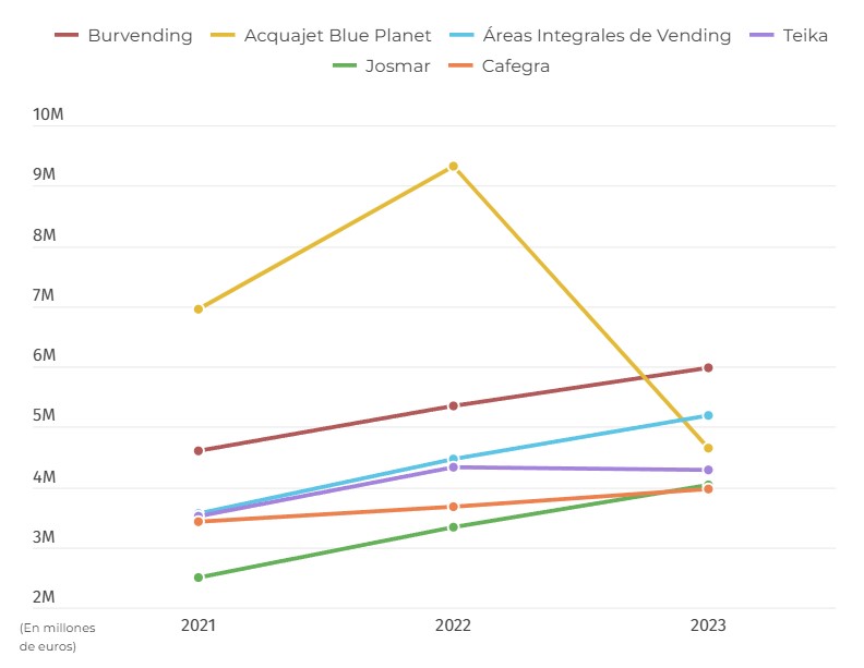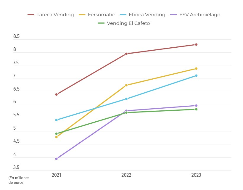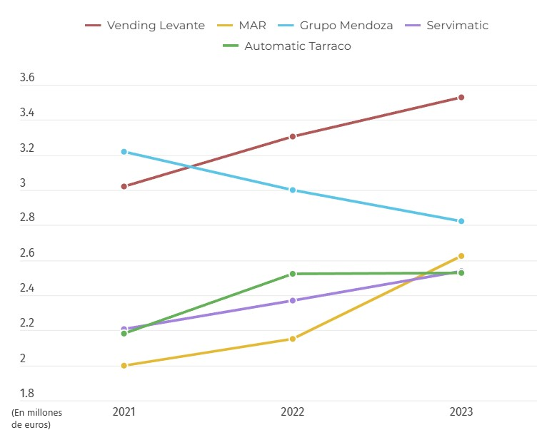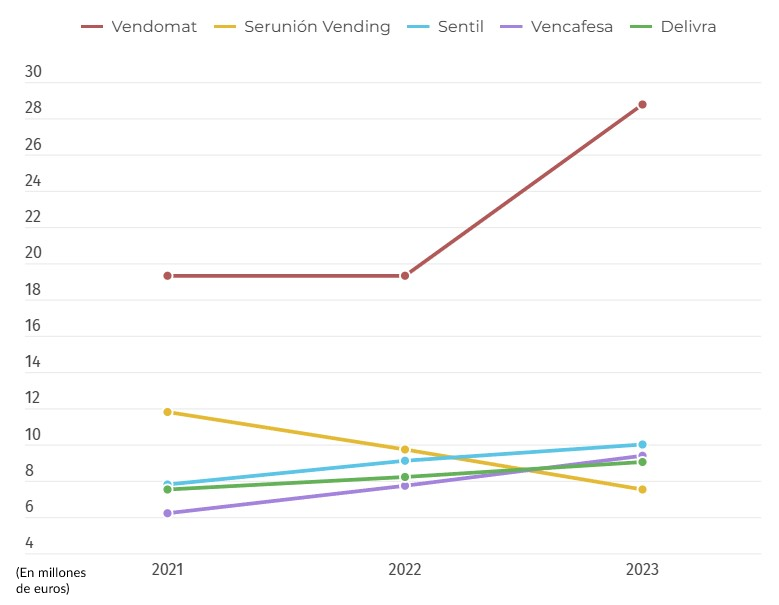 El despegue de Vendomat. En esta parte de la tabla, destacamos el ascenso de Vendomat, con un aumento de casi 10 millones de euros, con la que defiende su sexta posición. El resto continúan ese crecimiento que marca 2023.