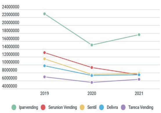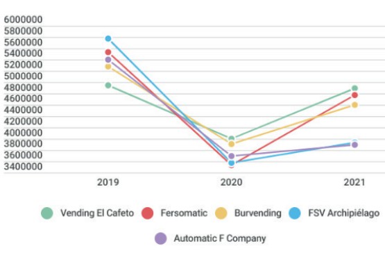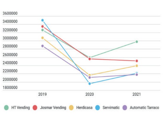 Adelantamientos en la parte media: Entre las siguientes empresas de la zona media de la tabla, empezamos a encontrar más cambios de posiciones, como el ascenso de Josmar Vending; y crecimientos paulatinos como el de Burvending, que pasa de 5,3 a 5,9 millones de euros.