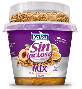 HOSTELVENDING.com 20/10/2016.- Más donde elegir entre las especialidades de Kaiku Sin Lactosa. La compañía acaba de lanzar para esta gama de productos entre yogur y snack su nuevo sabor Mix Melocotón y Maracuyá, una propuesta “para llevar” que combina yogur sin lactosa, muesli y trozos de melocotón y maracuyá.