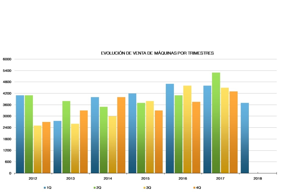 HOSTELVENDING.com 30/07/2018.- El primer trimestre de este 2018 ha cerrado con unas ventas que superan las 3.700 máquinas de vending vendidas en España, lo que equivale a un 20% menos que el mismo trimestre del año 2017.