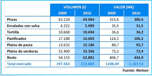 El sector de platos preparados refrigerados, que consolida ventas conjuntas de 213.000 toneladas y 1.167 millones de euros, registró crecimientos de 2 dígitos tanto en volumen como en valor de ventas en la década pasada. Sin embargo, la crisis económica y una ralentización en el ritmo de crecimiento del sector han provocado una racionalización del sector, reorganizándose las categorías, las marcas y los operadores en el mercado.
