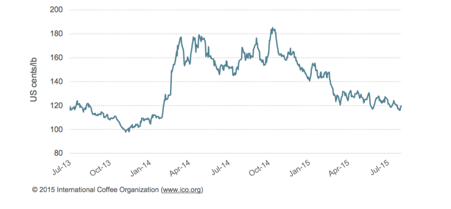 HOSTELVENDING.com 20/08/2015.- Aunque el consumidor final no lo note, el mercado del café experimenta un descenso generalizado de precios, caída que llevan a la industria a registrar sus valores más bajos de los últimos 18 meses. Según datos de la Organización Internacional del Café, en julio los precios volvieron a contraerse reaccionando así a la depreciación del real en Brasil que cayó a su mínimo de los últimos 12 años frente al dólar estadounidense.