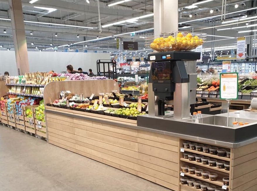 Así es, la mayoría de supermercados ya han establecido acuerdos con las grandes del sector para ofrecer a sus clientes zumo natural, y raro es ver ya una sección de frutería sin estas máquinas automáticas. En el caso de la cadena Leclerc, ha escogido un modelo de máquina automática.