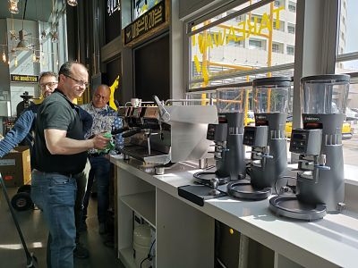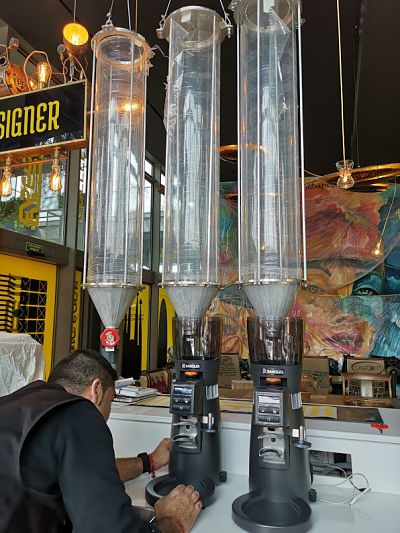 Además de con la RS1, el local está equipado con cinco molinos Rancilio Kryo On Demand, un molino dosificador que asegura que el barista tenga la dosis justa de café molido al instante.