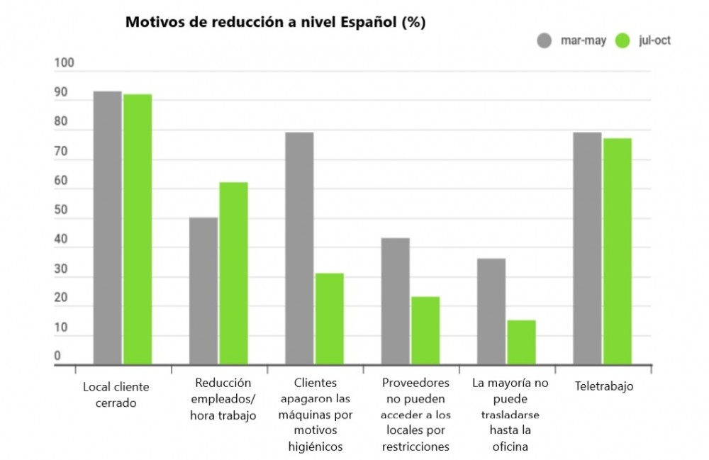 Las principales razones señaladas de la reducción de las ventas del sector en España, según refleja la EVA fueron: el cierre del local del cliente (93% en marzo-mayo y 92% en julio-octubre), seguido por las personas que trabajan desde casa (79% y 77%) y la reducción temporal de empleados/horas de trabajo (50% y 62%).