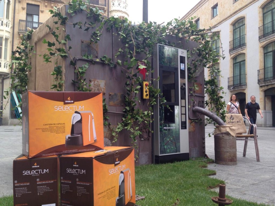 HOSTELVENDING.com 04/06/2015.- La plaza del Liceo de Salamanca amanece transformada en un escenario selvático en el que cualquiera que se acerque puede pararse a degustar un café. Se trata de la nueva acción de street marketing organizada por Sanven y para la que cuenta con la colaboración de Café Candelas y Jabuba Films, empresa encargada de la producción con el apoyo de la Salamanca Film Commission.