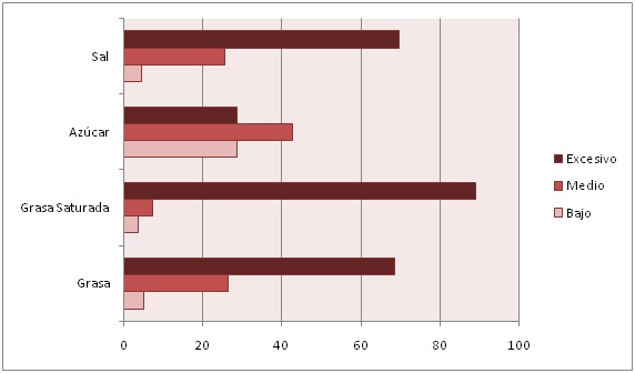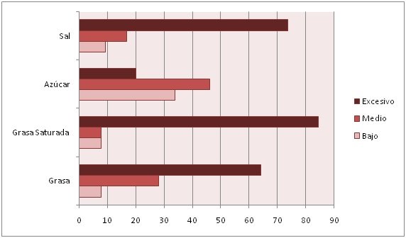 De acuerdo a esta lectura, el porcentaje de grasas, grasas saturadas y sal resulta, de media, excesivo. Únicamente en el caso del azúcar podemos hablar de un mayor porcentaje de alimentos que tienen una cantidad de azúcar “baja” (en torno al 30%) o “media” (superando el 40%).