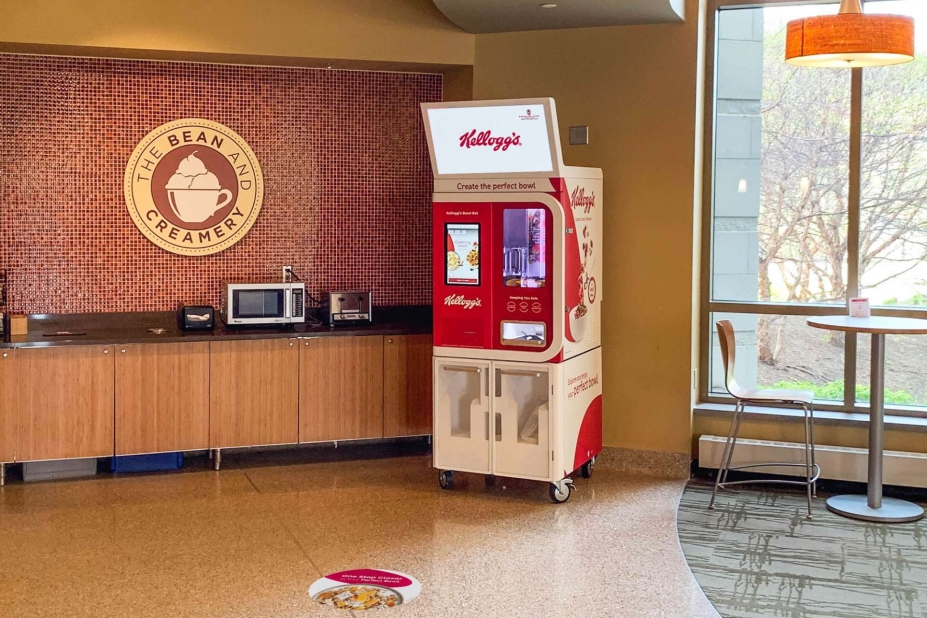HOSTELVENDING.COM 28/06/2021.- Creada bajo un proyecto piloto entre Kellogg’s Away from Home (la división que trabaja con los operadores de vending) y Chowbotics (una startup especializada en robótica), surge Kellogg’s Bowl Bots, que ya se ha probado en algunos campus universitarios estadounidenses.